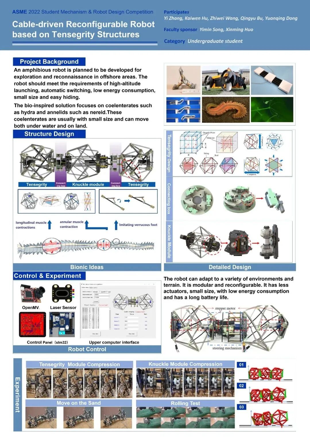 美国ASME学生机构与机器人设计大赛是一项为本科生和研究生提供展示其机械装置或机器人设计和建造能力的竞赛。2022年8月,MRS实验室本科生团队作品“Cable-driven Reconfigurable Robot Based on Tensegrity Structures”斩获2022美国ASME学生机构与机器人设计大赛本科生组第三名。