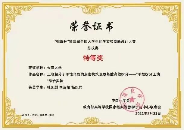 在此培养模式下,侯班全员进入课题组进行科研训练,并富有创新性地提出自己研究方向上的问题,获申的大创项目涵盖国家级1项、省市级3项、校级1项。在刚刚结束的“微瑞杯”第三届全国大学生化学实验创新设计大赛总决赛中,侯班人的创新实验作品荣获全国特等奖,这也是天津大学首次斩获该赛事全国总决赛最高奖项。