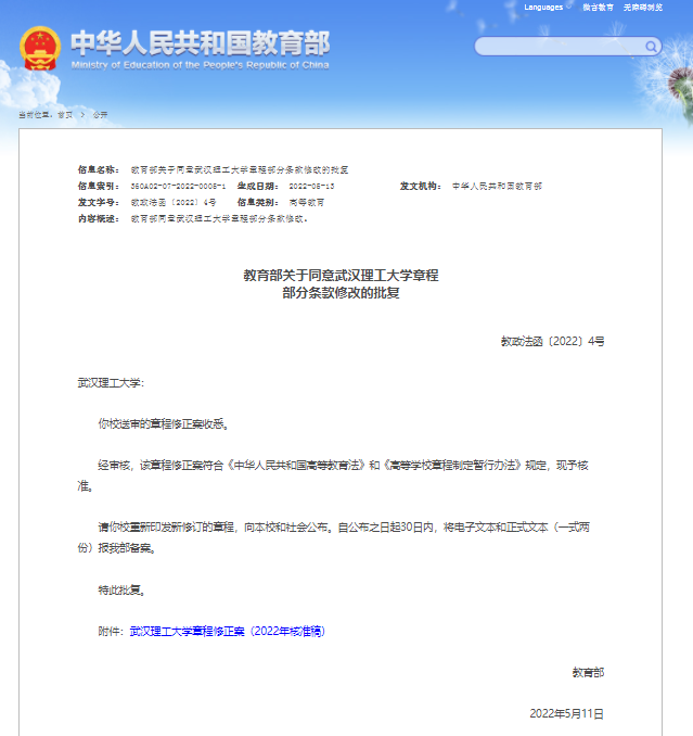 2021年8月,教育部网站以《武汉理工大学“四个强化”推进依法治校》专题推介我校依法治校工作经验。