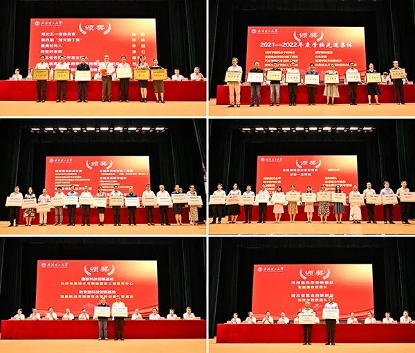 副校长陈文宣读《武汉理工大学关于表彰2021-2022年度学校先进集体和先进工作者的决定》等人事人才表彰与科研质量奖励有关文件决定;副校长王发洲宣读《武汉理工大学关于表彰2021年度本科人才培养与专业建设优秀团队和个人的决定》;校党委副书记夏江敬宣读《武汉理工大学关于发放2021年度捐赠奖励的决定》;副校长刘春江宣读《中华全国总工会关于表彰2022年全国五一劳动奖和全国工人先锋号的决定》等工会有关表彰文件。