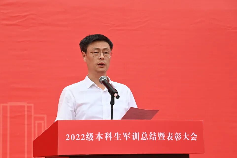 王世杰副校长在汇报表演后发表总结讲话。他希望,同学们积极巩固和发扬军训历练的顽强意志、良好品德和优良作风,脚踏实地、自强不息,将青春的正步进行到底。