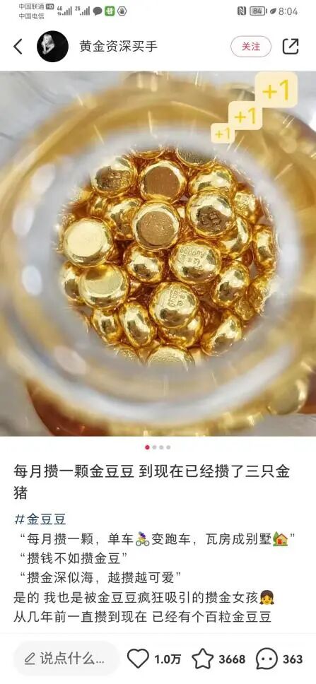 小红书ID为“换个名字”也表示,其买金豆纯粹就是为了积少成多,像是一种定期存款。