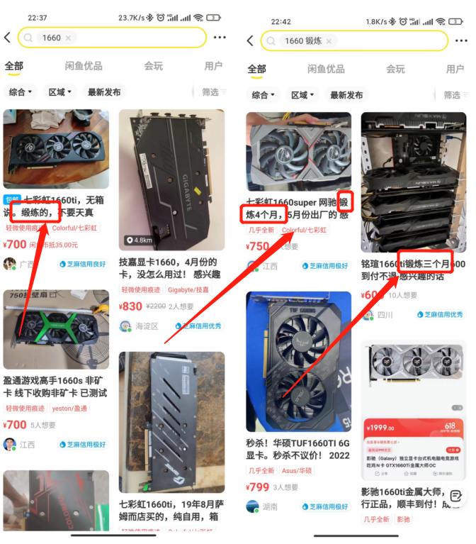 在闲鱼等二手平台上,目前已有大量矿老板开始批量抛售显卡。而且关键词均标注上了“锻炼”二字,直接标明了这是矿卡改装,并且标明了锻炼的时长。