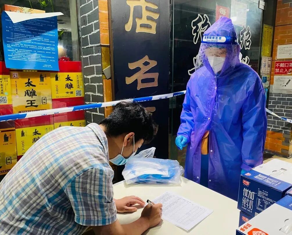 王赵婷回忆说,下午一点多接到任务,等完成信息登记并贴好封条时已经是深夜十一点半。第二天一早,王赵婷又出发了,她要跟队员们再次对可乐路店铺进行查遗补漏的检查,简单吃过午饭后,又要挨家挨户为商铺分发食品和抗原等物资。