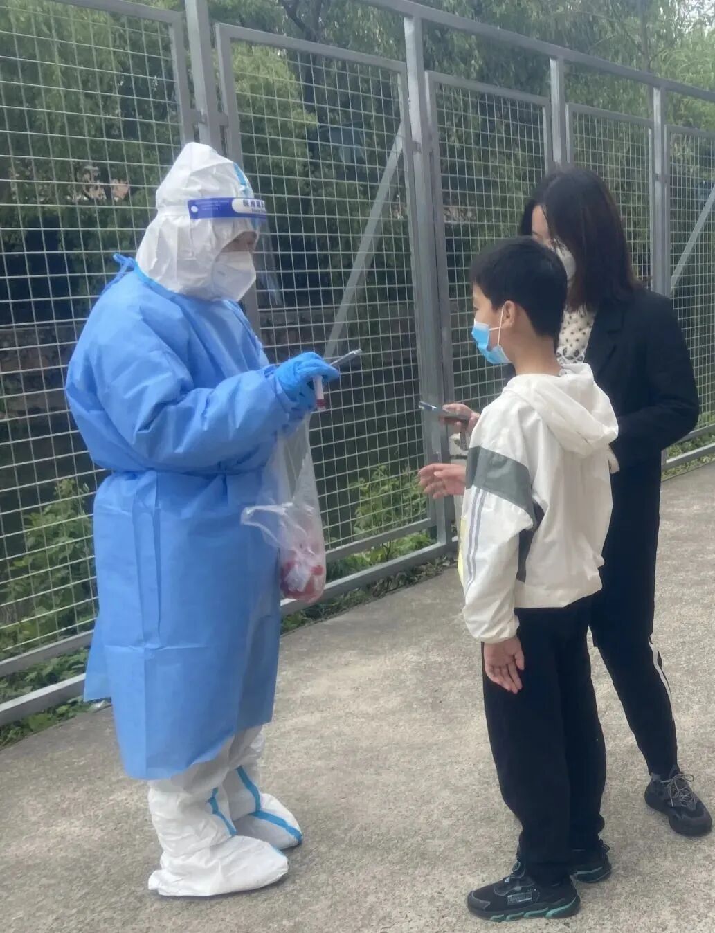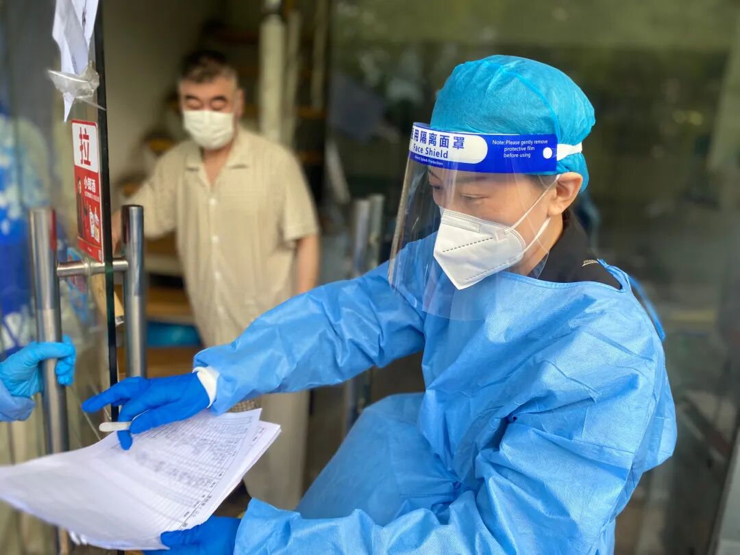 第一次任务是到淞虹路上的某连锁酒店协助核酸检测,“学习贴试管码纸、使用扫码手机。不知道是防护服闷热还是自己高度紧张,还没真正开工,后背已经全部湿透。”好不容易进入排队扫码流程,新的挑战又开始了,不断提醒“间隔两米、拧松瓶盖”的同时,还要维持队伍秩序,防止流动人员误入住店人员检测队伍,提醒路边的快递小哥到指定地点做核酸检测。3个小时不知不觉过去,王岚说,直到脱下防护服,扎紧医废袋后才感觉到自己又饿又渴。