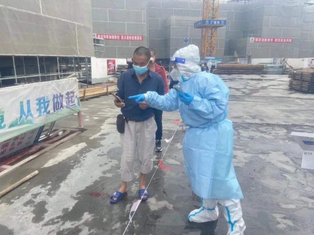 四月初到五月初,张燕和队员们的主要工作是在新泾镇各工地和酒店公寓协助核酸检测,常常是一天之内跟随医务工作人员转场好几个点位。随着天气开始逐渐变热,对志愿者而言体力消耗是个挑战。往往是一穿戴好防护服,汗水就沿着脖子往下流。“但是每每想到那些医务工作者要持续工作那么久,每每听到大家一句‘你们辛苦了’,我就觉得有了坚持下去的动力。”