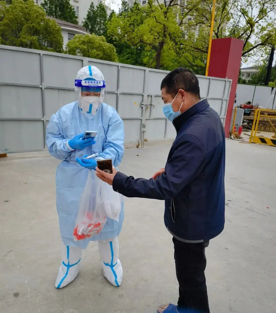 有了第一次的经验,后面的志愿者工作顺利了许多。王岚跟着社区卫生服务中心的医生来到新泾镇辖区沿街商铺、宾馆旅馆、在建工地等场所,为相关人员的核酸检测采样做协调服务,并进行扫码登记、医废清理等工作。