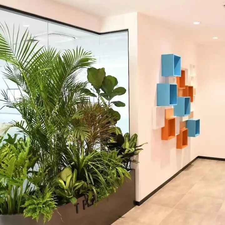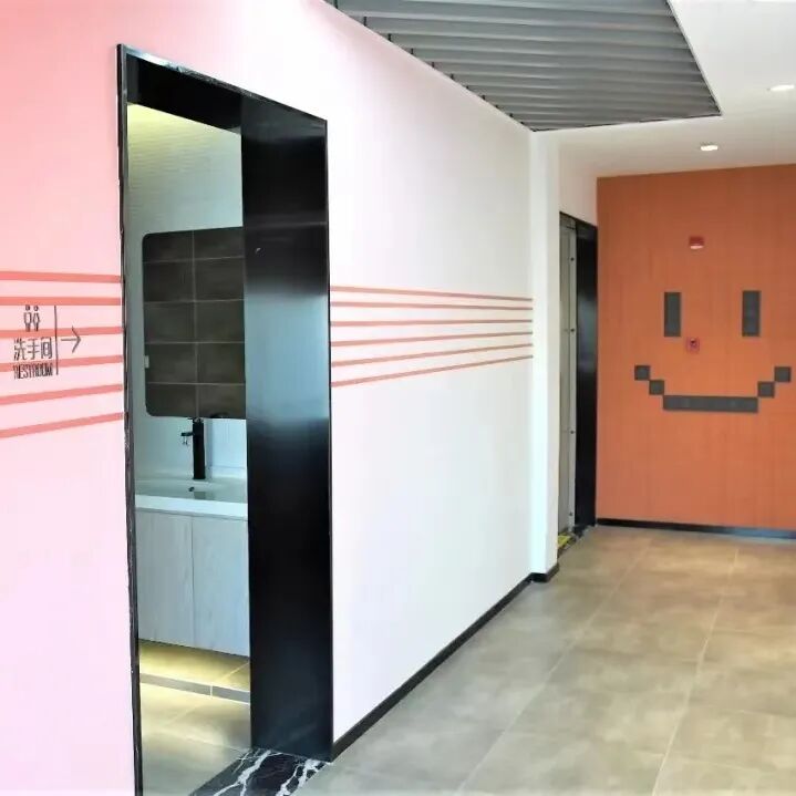 内部空间的设计风格与园区外部截然不同,多色彩的合理搭配再辅以绿植点缀,呈现出色彩明亮、清新舒适、富有活力的办公空间。