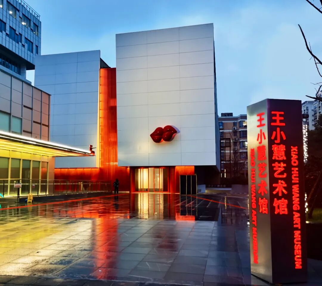 行至威宁路369号,目光便会不自觉被一座外观红白相间的建筑“紧紧抓住”。整栋建筑共4层,展示空间达2000余平方米,艺术家王小慧的代表性作品——由两个蟠桃组成的红嘴唇雕塑装置“艺术之吻”是新馆的主标志。