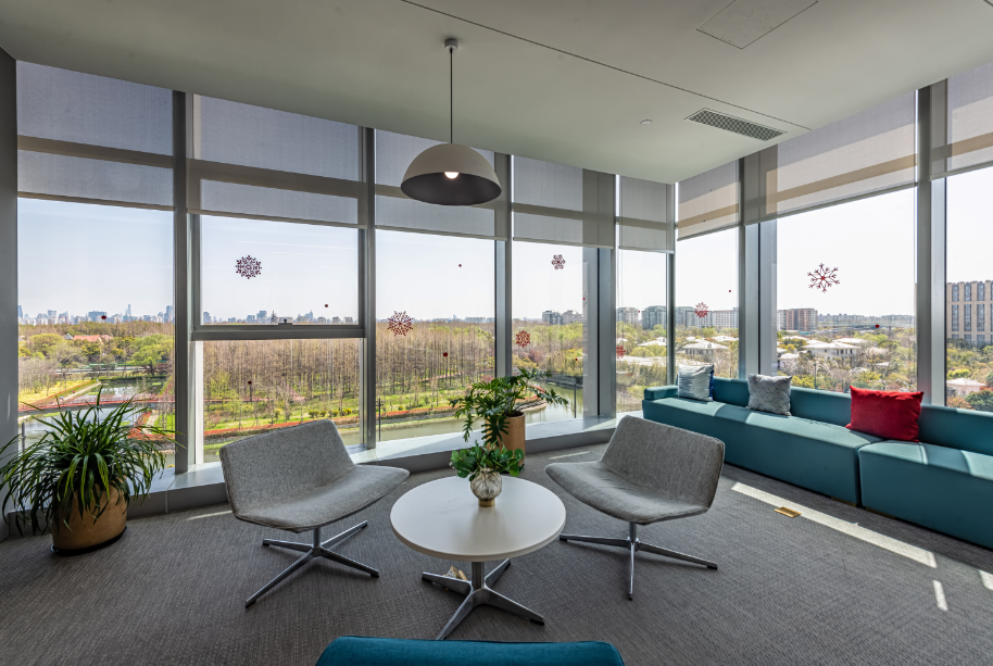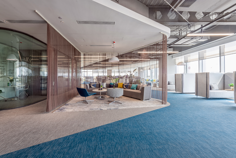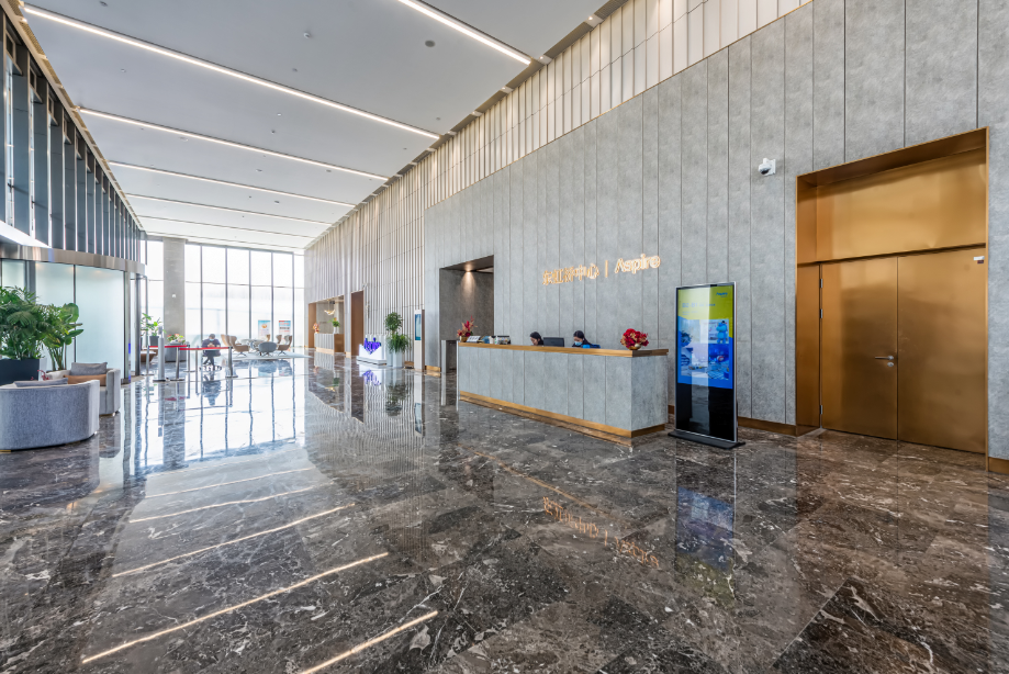 办公区域,硬装工程均已完工,大理石与金属色冷暖搭配相得益彰。地砖、吊灯、VRF空调系统等已安装完毕,桌椅等软装正陆续布置中。以“依托空港经济的企业总部办公园区”为定位,中心办公楼已吸引招商蛇口上海公司及华东资管公司、东航金控、东航投资、邮美航空、热璞科技、开勒股份等企业入驻。
