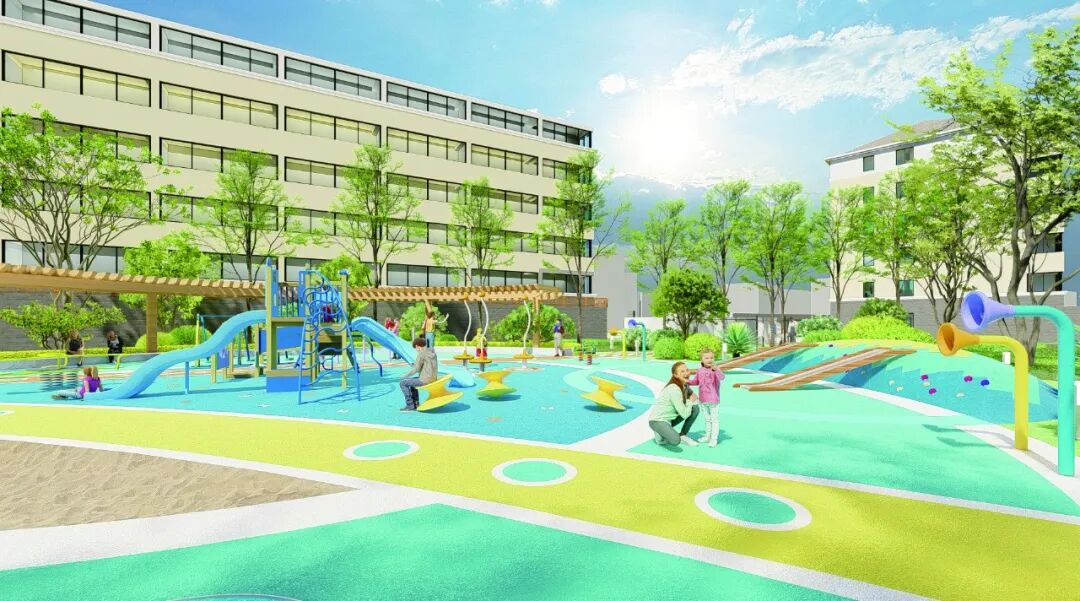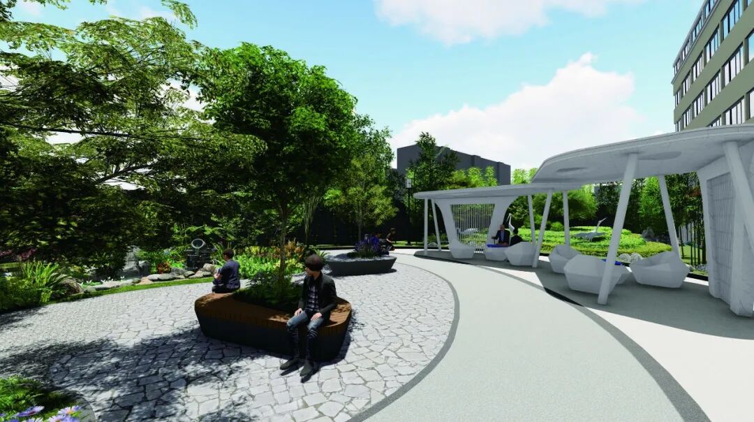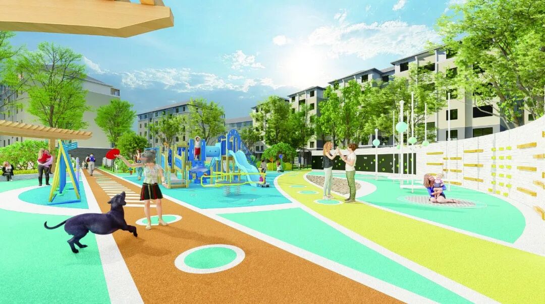 位于主出入口西侧原有的一处休闲广场将重新划分和拓展,改造成融大龄儿童活动区、老年健身休闲区以及低龄幼儿活动区为一体的全年龄段休闲区。儿童活动区增加儿童活动设施以及沙坑、景墙、蹦床等设施,提高场地的氛围感和互动性;增加老年看护人休闲区,四周绿化围绕形成密闭空间,道路连接主路。