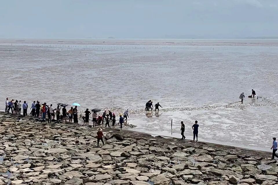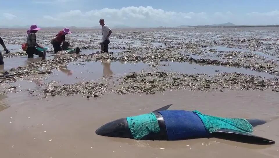 得给鲸找到水续命。村民四五人一组,有的拽着鲸的尾鳍,有的抵着腹部,把鲸推到滩涂低洼处,这里还残存着浅浅的海水——后经专家提醒,村民才知,不应硬拽鲸的尾鳍,那样鲸很容易受伤。