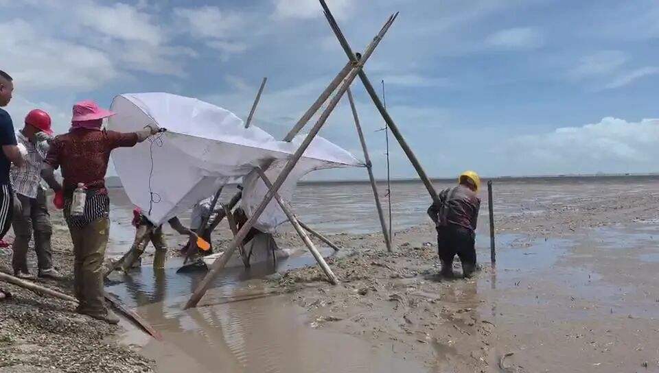 时近中午,气温高达34℃,王超抬眼看了看毒辣的阳光,不能让鲸就这么被炙烤着,他和上盘镇副镇长吴欣俊商量,要给鲸搭“凉棚”遮阳。但在荒芜的滩涂上,可没有什么现成的材料。