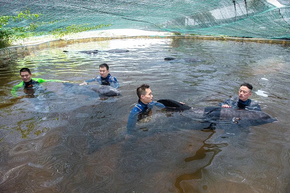 放入养殖池的瓜头鲸被悉心照料,人们托着鲸在水中缓缓前行,辅助这些“泳坛健将”找回游泳的感觉。 (人民视觉 陈中秋/图)