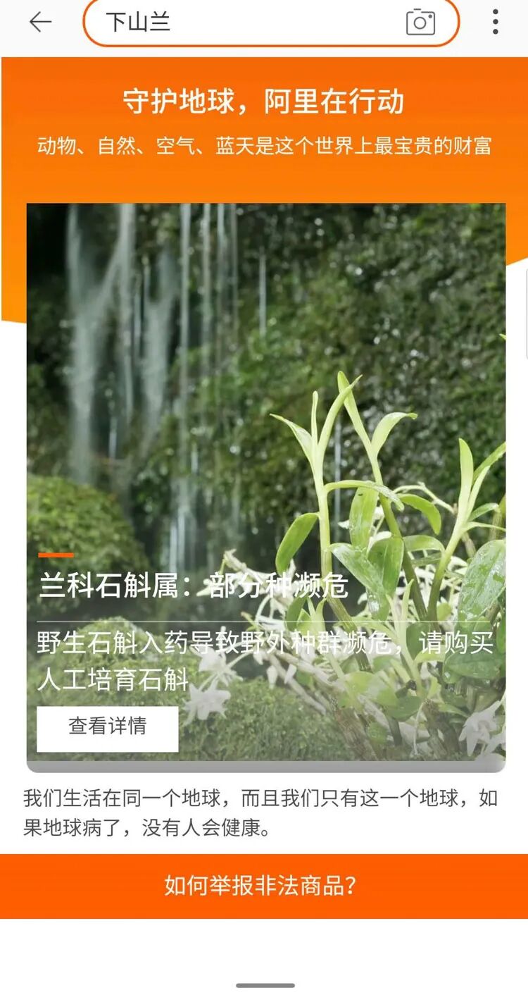 淘宝App搜索“下山兰”,会提醒“野生石斛入药导致野外种群濒危,请购买人工培育石斛”。 (淘宝app截图/图)