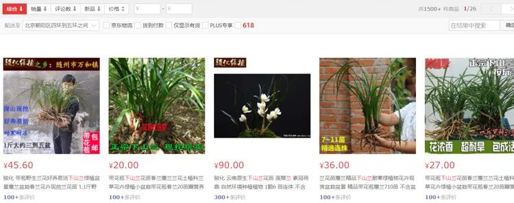 在快手、抖音、闲鱼、淘宝、京东等网站或App搜索“下山”,会出现大量公开售卖野生植物的商家,伴随着“野生”“纯天然”等噱头,镜头对准的是蕙兰、石斛、重楼、毛慈姑——普通人并不熟悉但都很“畅销”的植物。