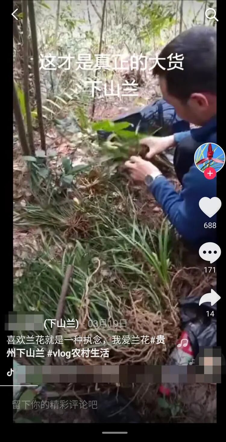 没见过独花兰等兰花?没关系,在快手、抖音等短视频平台搜索“下山兰”等关键词,可360°“观赏”这些小小的植物。采挖者们多为当地村民,通过直播以及短视频,将观众导流到个人的微信号交易,也有人直接将“成果”挂在淘宝、闲鱼等电商平台。