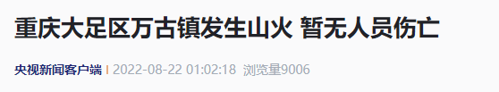 2022年8月18日22时许,江津区支坪镇仁龙村发生山火。江津区第一时间启动应急预案,组织力量扑救。目前,附近居民已及时疏散,无人员伤亡。8月20日15时左右,重庆市铜梁区与大足区毗邻的永嘉镇圣水村、围龙镇龙韵村山林发生火灾。铜梁区迅速启动应急预案,区委区政府主要领导第一时间奔赴现场坐镇指挥,迅速组织应急力量650余人紧急扑救。目前,无人员伤亡,周边群众已及时转移安置。过火面积正在核查,起火原因正在调查中。记者从重庆市大足区委宣传部获悉,2022年8月20日下午14时43分左右,重庆市大足区万古镇新石村所辖山林发生火灾。重庆市和大足区迅速启动应急预案,现已组织市区应急力量1500余人紧急扑救。目前,无人员伤亡,周边群众已转移安置。过火面积和起火原因正在调查中。