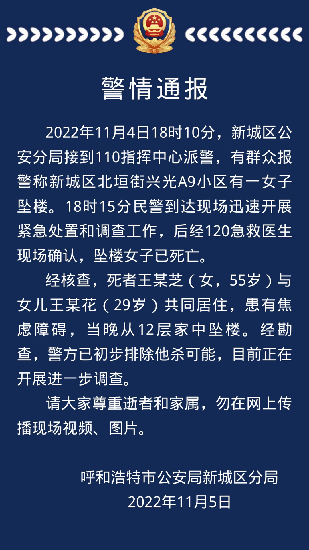 内蒙古呼和浩特市公安局新城区分局11月5日通报: