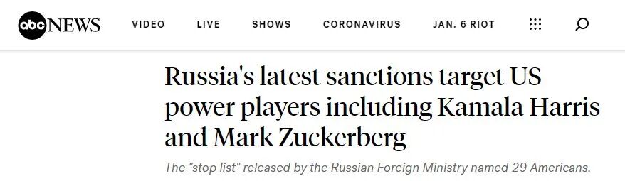 俄对美新一波制裁中包括美副总统哈里斯,引发美媒关注。图片来源:美国广播公司报道截图。21日,俄外交部宣布,对29名为“反俄议程”服务的美国人士等实施制裁。美国媒体很快让这事上了大头条——俄制裁名单中包括美副总统哈里斯和脸书创始人扎克伯格。莫斯科还禁止 61 名加拿大人进入俄罗斯。这些都可以说是对西方套路的现学现用。