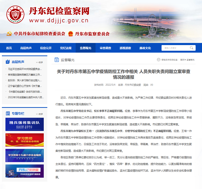辽宁省丹东市纪委监委4日发布关于对丹东市第五中学疫情防控工作中相关人员失职失责问题立案审查情况的通报,全文如下: