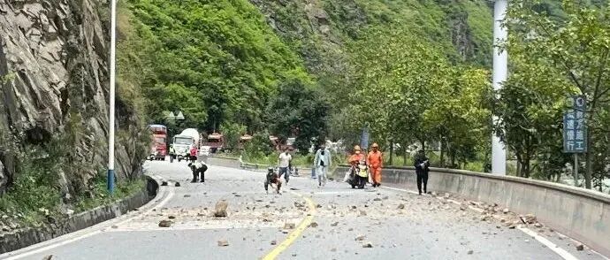震区的道路沿途的垮塌和落石。 四川森林消防供图
