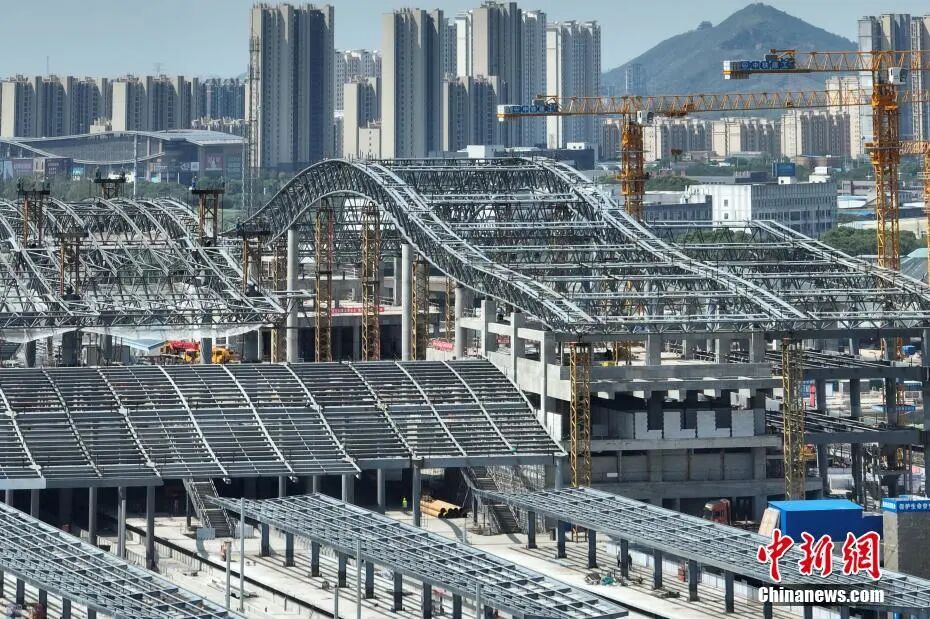 图为航拍南沿江铁路江阴站站房屋面钢结构桁架整体提升现场。(无人机照片) 中新社记者 泱波 摄