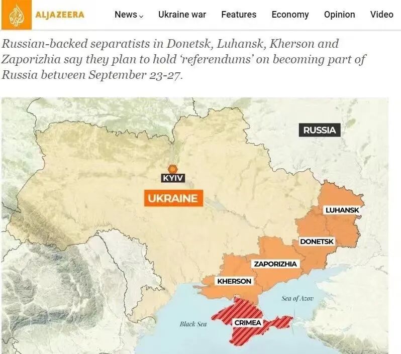 9月23日至27日,乌克兰四地举行“公投”,决定是否“加入”俄罗斯。图片来源:卡塔尔半岛电视台报道截图
