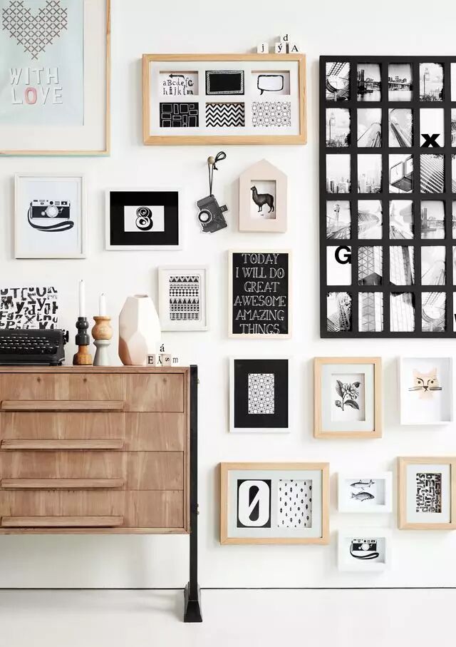 细黑框,黑白照片,规则排列,照片与画框形状比例,留白,大面积铺。很棒的照片墙范例,腔调爆棚!