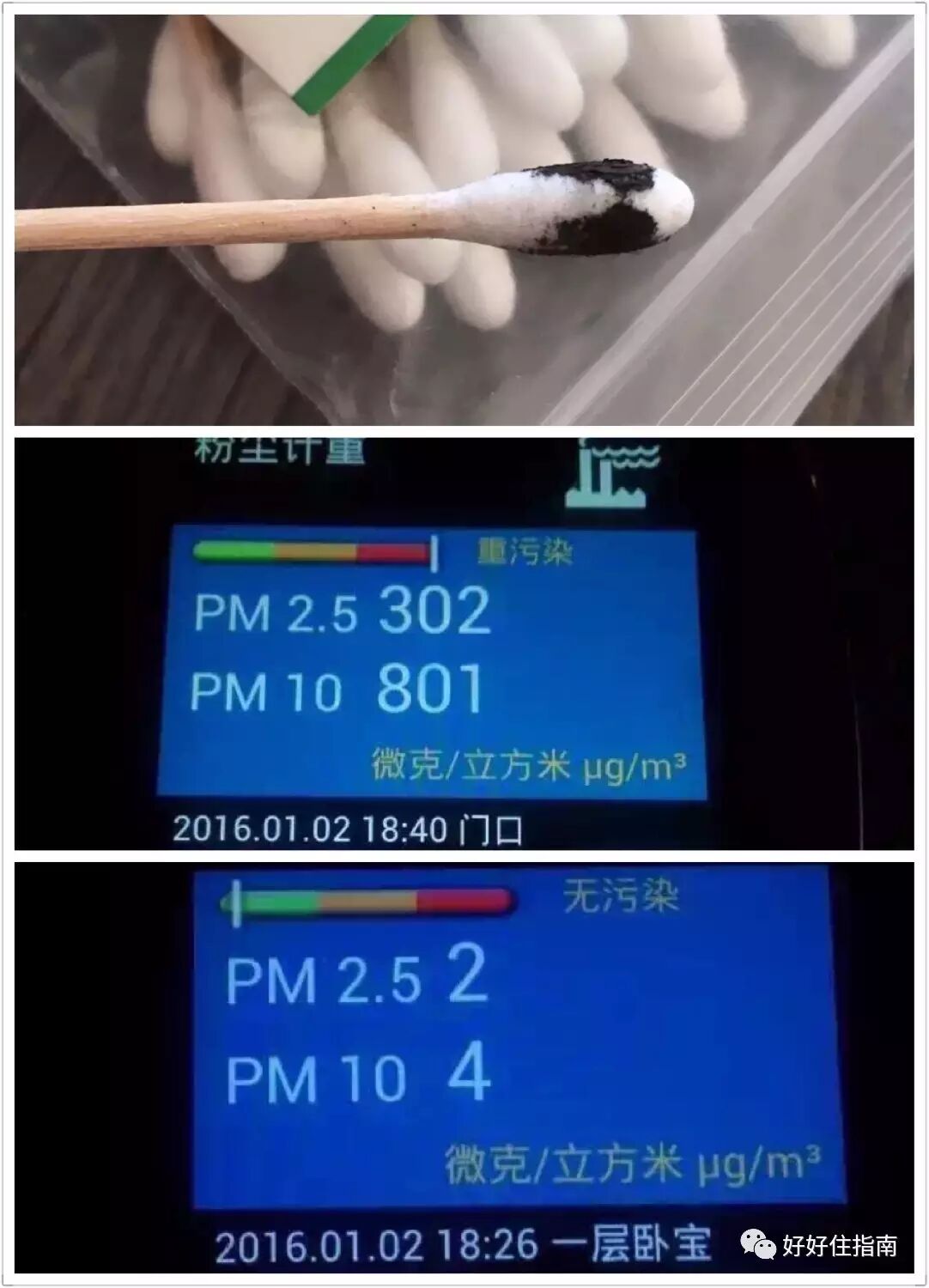 屋主说 今年年初入住半个月,第一次清洗新风机的静电除尘器时,已经冲洗过后,棉棒擦一下,仍然是黑的。图二是当天室内外PM2.5的测量结果。