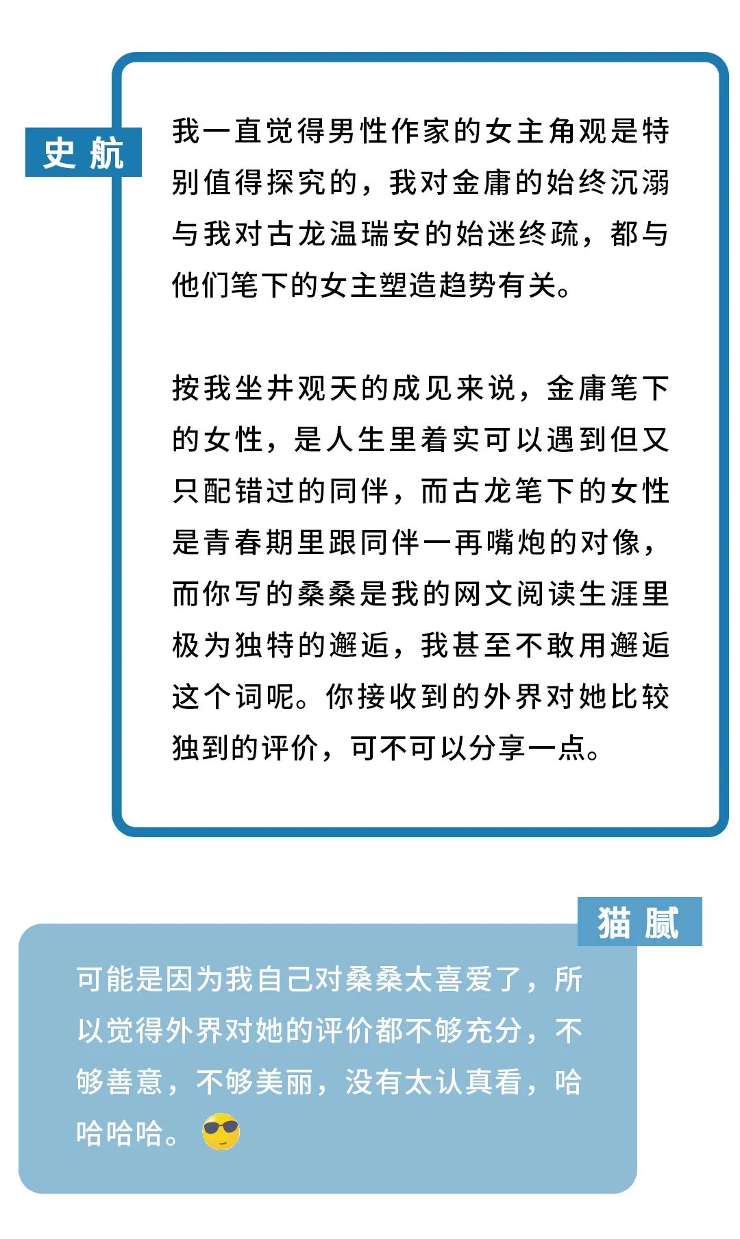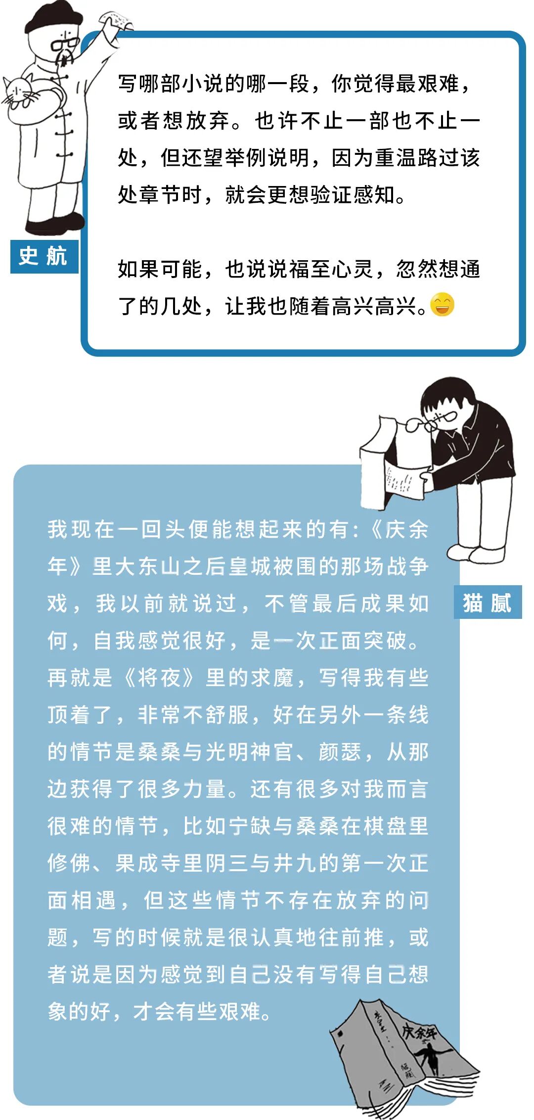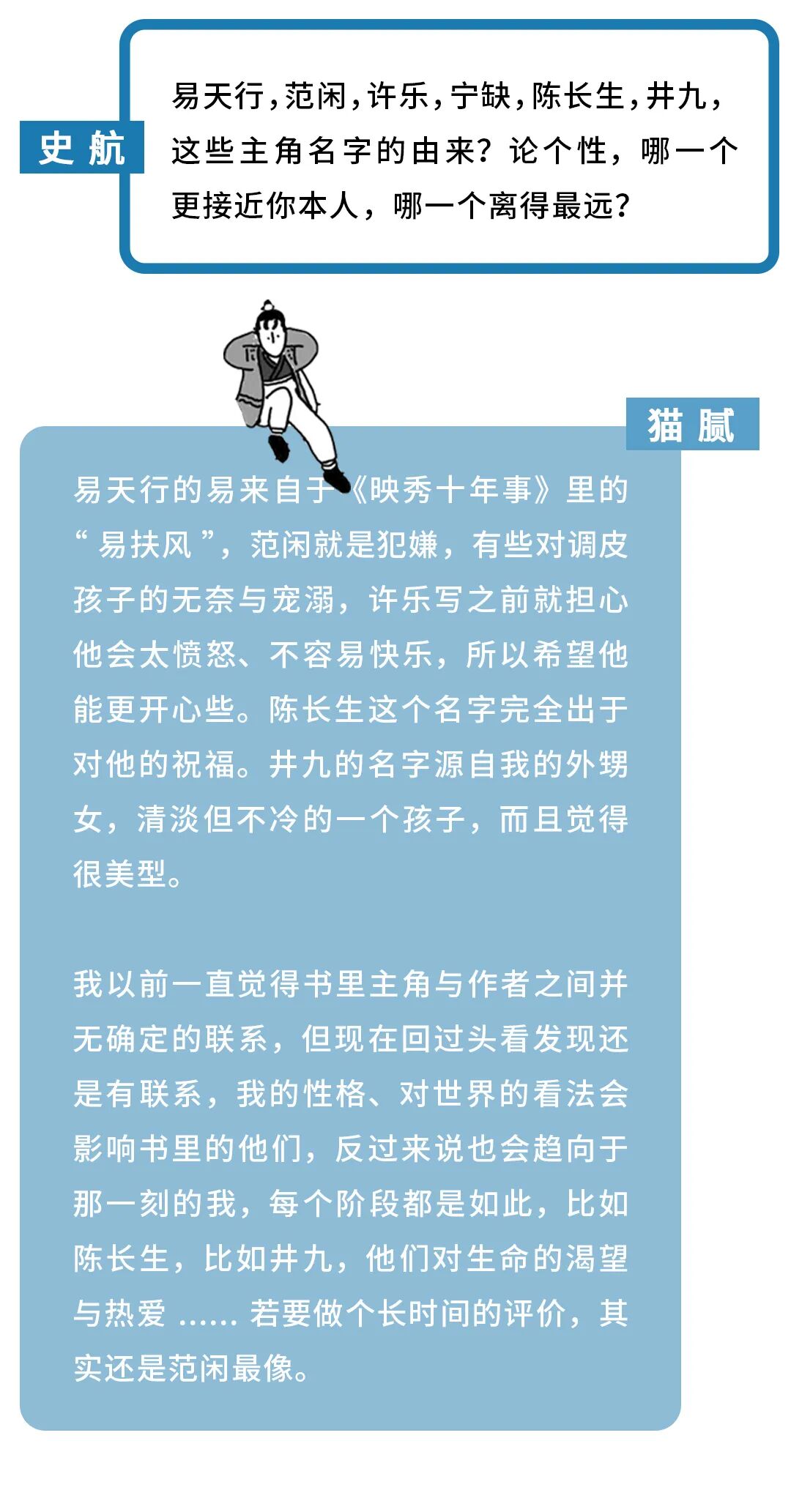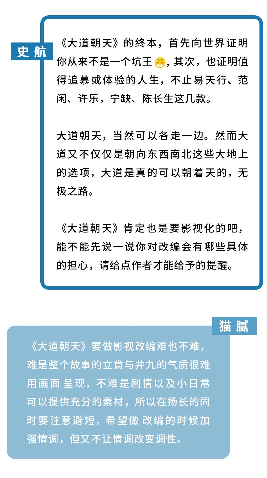 而编剧史航是猫腻的资深读者。他反复阅读猫腻的作品,着迷于其中人物的美感、故事的哲思。