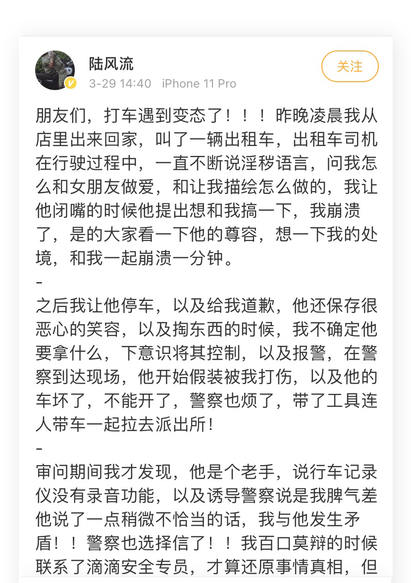 最近,一位男性博主@陆风流 在打车过程中被男性司机骚扰,司机不断说“淫秽言语”,警察处理后仍然没有自责还言语威胁,博主即使是男性也感到“恶心和害怕”。高赞评论称“很多时候男性只有亲身经历过,才会明白女性遭遇性骚扰,维权有多不容易”。