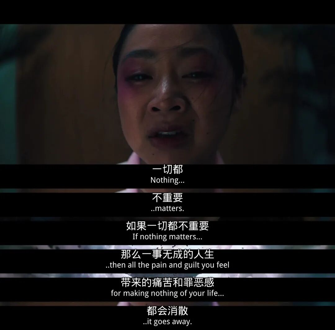 秀莲在影片中的行为,又恰好对应存在主义的态度,比如在多重宇宙中体验更多的人生;尽可能地爱,用“爱”的力量对付所有敌人,唤醒他人记忆中的“爱”。