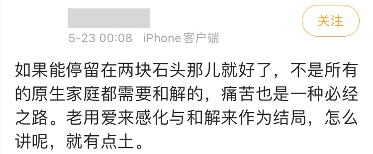 也有的人不喜欢煽情的后半部分,以为结局停在“石头的无声对话”这段情节最好。