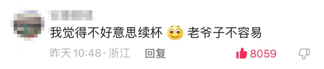 网上看到“良心爷爷”报道后,慕名而来的小余看到老谢盛饮品的杯子为450毫升,“一个人喝完全够了,确实没必要再续杯”。小金原打算续杯,结果被同行的朋友劝阻了,“大爷不容易,别贪这个便宜。”