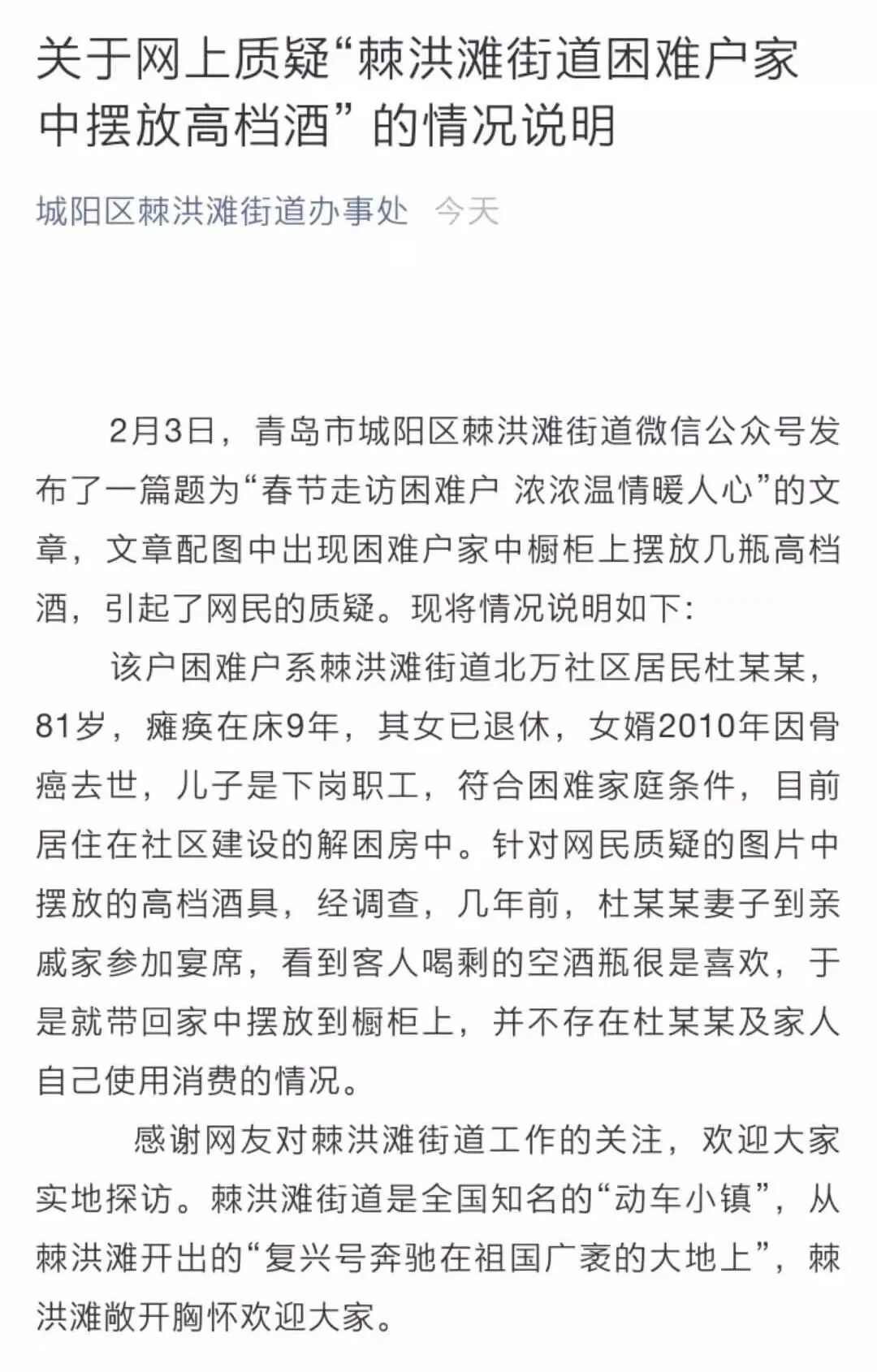 今天,该公众号删除了这篇报道,并发布《情况说明》解释说:这个困难户家里有瘫痪在床的老人,女儿已经退休了,儿子是下岗职工,符合困难家庭条件。至于酒瓶子,是参加宴席后带回家的,没啥问题。