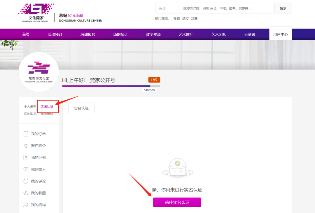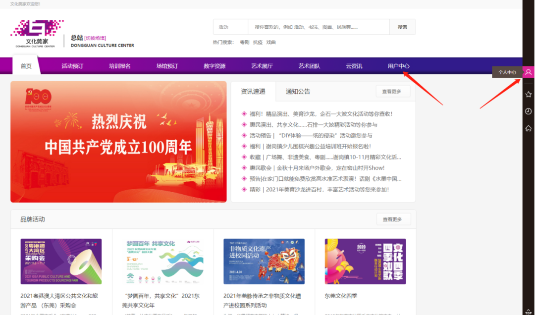 1、打开文化莞家PC端平台www.dgswhg.com并登录。点击右边上方菜单栏最后的“用户中心”或屏幕最右边的栏目“个人中心”即可。