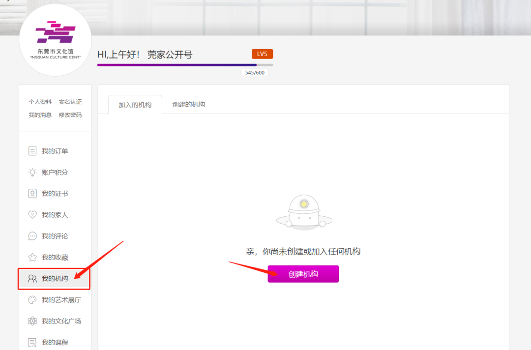 5、点击左边菜单栏的“我的机构”进行创建,填写完整点击“确定”即可完成提交。