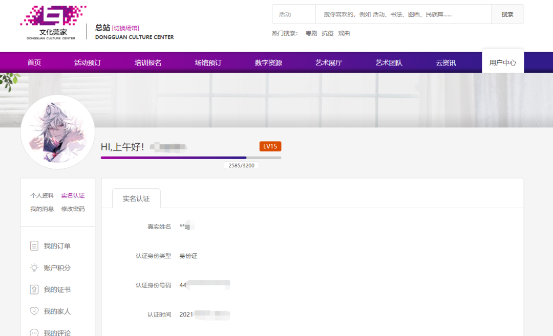 4、实名认证后,等待页面自动跳转回文化莞家平台,即认证成功。(请仔细核对平台内的个人信息是否有误)