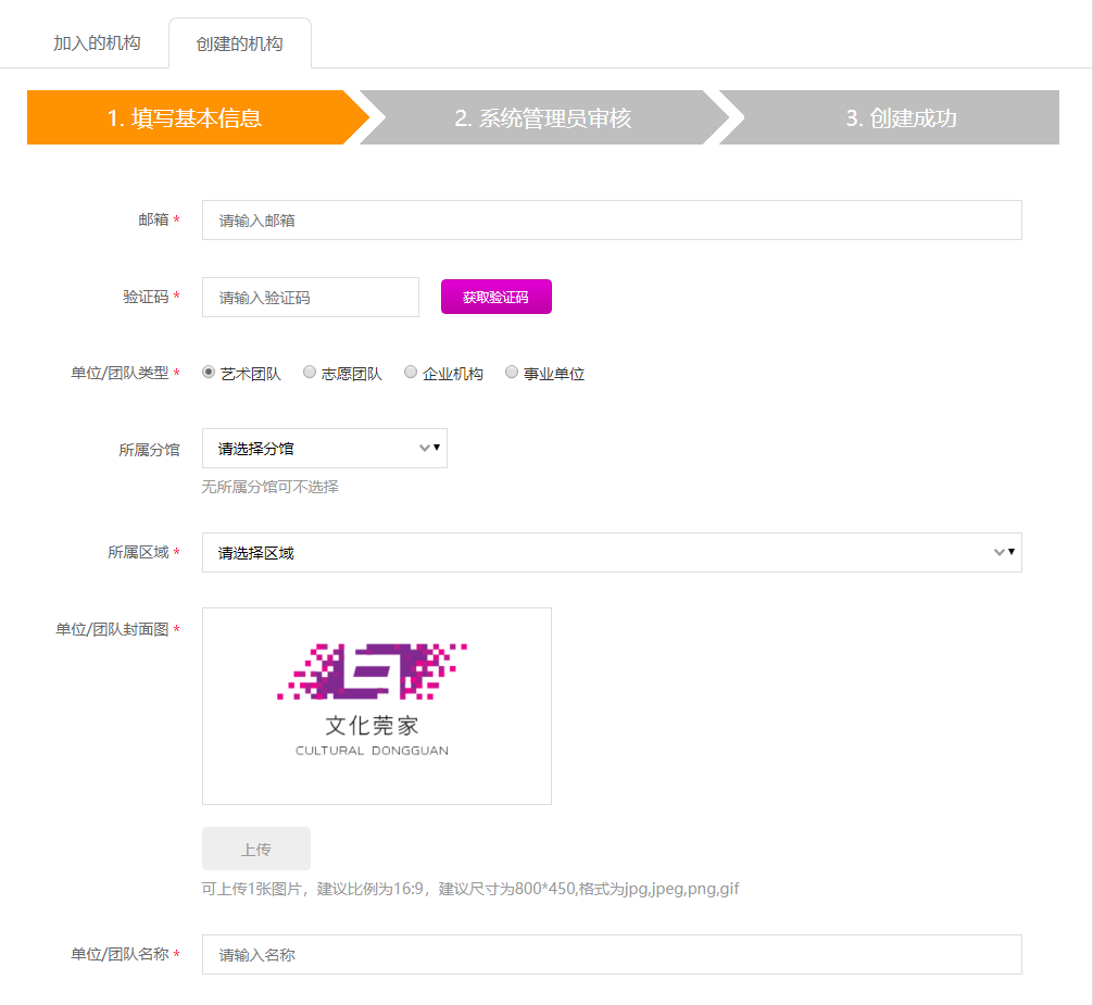 注意:2021年6月前已在文化莞家平台创完成创建的单位/团队,请联系市文化馆信息部(0796-22837270)提供正确的邮箱,完成账号绑定。完成绑定后直接从第7大点步骤开始操作。