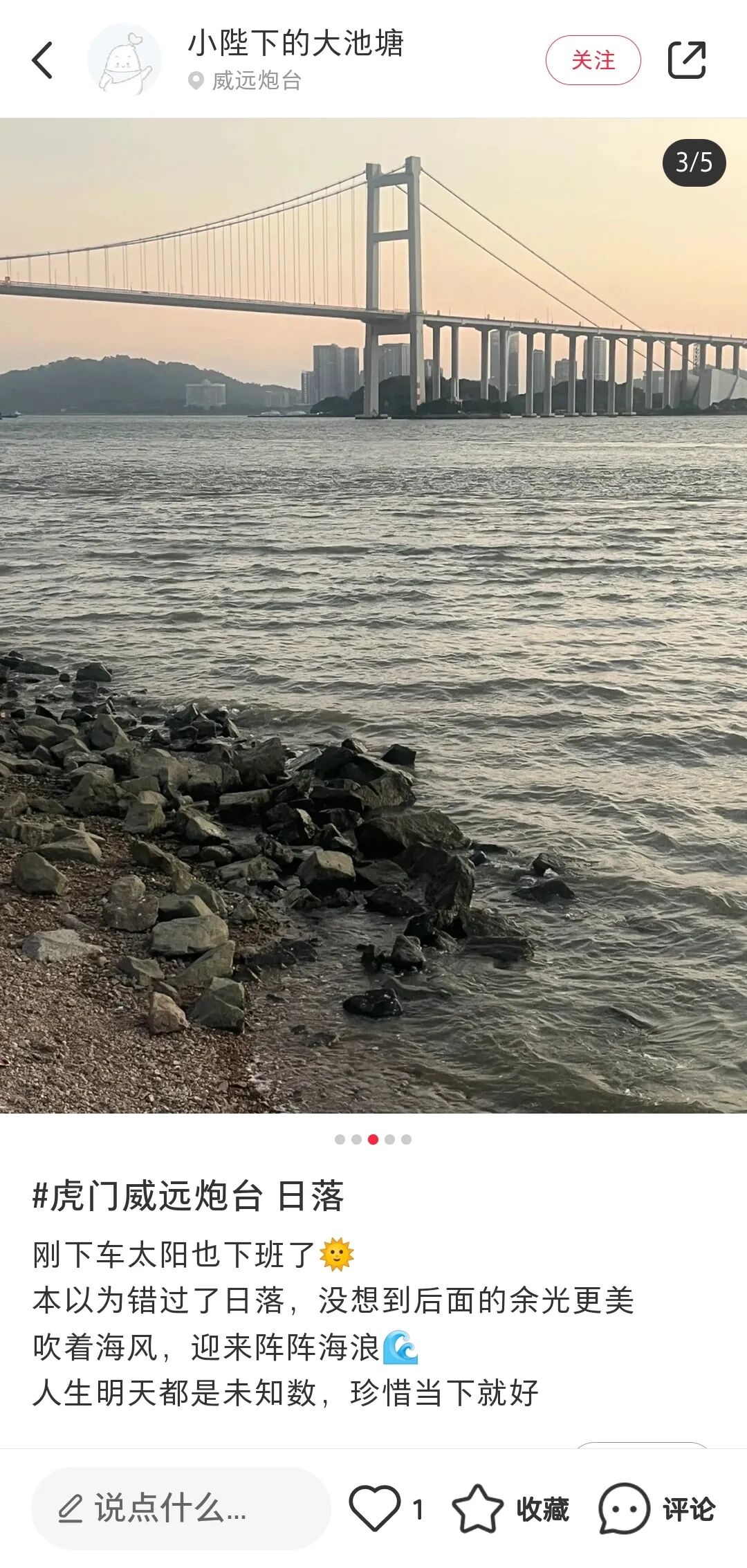 好多年轻人专程来到这里,在炮台的光影里拍摄创意作品,或是与虎门大桥一起欣赏海上的日落。