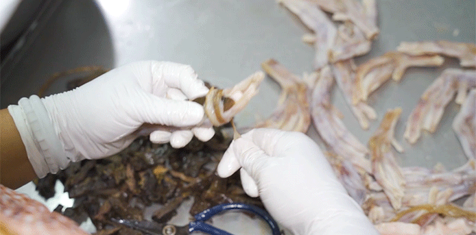 每一只都是手工制作,用腌制后的鸭脚包裹着秘制腌制的鸭肝,外面用特殊工艺腌制的鸭肠缠绕。包扎完成的鸭脚包,再进行晾晒和自然风干一个星期,待出油、收缩后颜色更光泽,飘出阵阵的腊香!