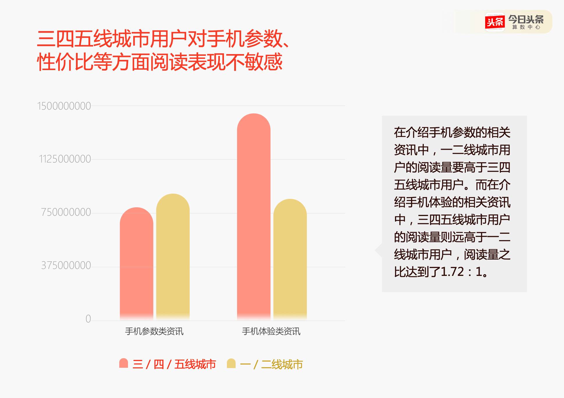 在阅读行为方面,三四五线城市用户更愿意收藏,手机资讯有可能作为购机决策的参考因素从而被用户收藏。一二线城市更愿意评论和分享,体现了用户更强的传播和参与意愿。