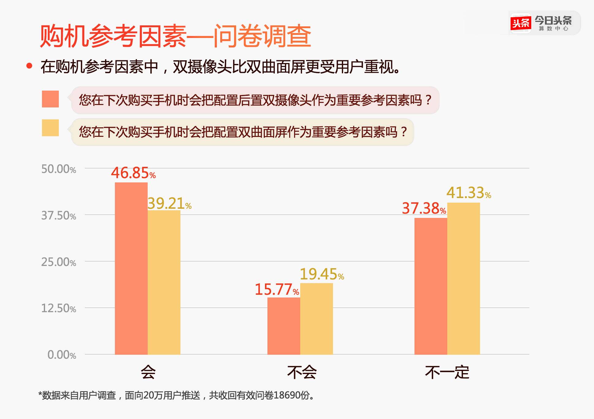 对今日头条用户投放的问卷调查显示,在购机参考因素中,双摄像头比双曲面屏更受用户重视。用户对双摄像头的付费意愿和负面影响接受度均高于双曲面屏。国内手机厂商对双摄的布局,相比海外品牌也更加积极。这与中国用户在购机中将拍照好坏作为十分重要的参考因素是密切相关的,双摄正在成为国产旗舰的标配。