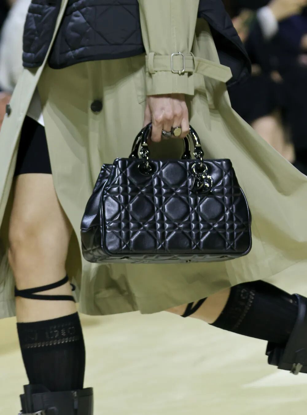 一贯经典的Lady Dior手袋,在秋季系列中由最初的手提包型,延展到了手拿、手提、肩带兼并的全新款式,在解放双手的同时也暗示着打破女性着装自由的桎梏;
