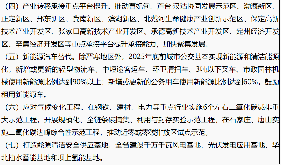 推动交通运输用能清洁化。全面实施非道路移动机械第四阶段排放标准,推进国四及以下排放标准的营运重型柴油货车淘汰,禁止生产、进口、销售不符合国家标准和京津冀区域要求的车用燃料。到2025年,国六排放标准以上重型柴油货车占比不低于30%。加快新能源车辆推广应用,推进氢燃料电池中、重型车辆应用。推动重点区域新增及更新的公交、环卫、邮政、出租、城市物流配送车辆的新能源替代,批发市场、快递转运中心、物流园区等建设充电基础设施,推广一批加氢示范站,到2025年,形成200万辆电动汽车充电服务能力,新能源汽车新车年销售量占比达到20%左右。加快发展清洁航运,鼓励船舶进行发动机升级或尾气处理,推动船舶使用氢燃料电池,靠港船舶使用岸电和电驱动货物装卸,在沿海地区研究设立船舶氮氧化物排放控制区。到2025年,秦皇岛港、唐山港、黄骅港80%的5万吨级以上泊位(油气码头除外)具备岸电供应能力。支持机场开展电动化设备建设和应用,探索实施停靠廊桥飞机全部采用陆电辅助动力装置(APU)供电供气,机场新增作业车辆和机械基本实现电动化。