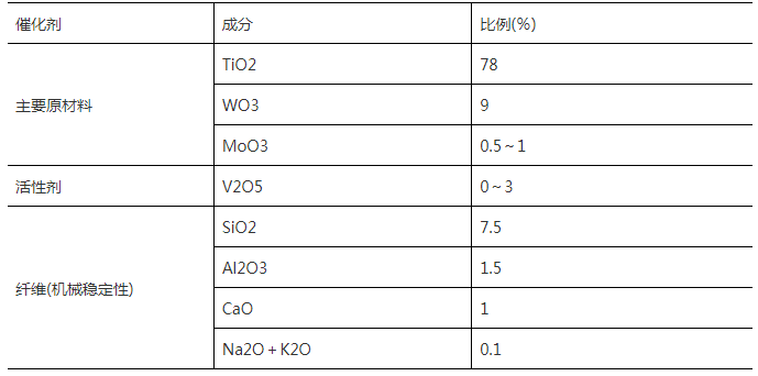 商业SCR催化剂活性组分为V2O5,载体为锐钛矿型的TiO2,WO3或MoO3作助催剂。SCR催化剂成分及比例,根据烟气中成分含量以及脱硝性能保证值的不同而不同。
