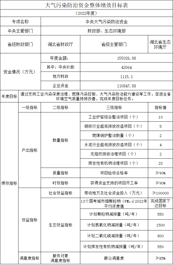 湖北省财政厅下达2022年中央大气污染防治资金,合计下达资金4.3064亿元,通过支持工业污染深度治理、燃煤污染控制、大气污染防治能力建设等工作,促进全省环境空气质量持续改善,完成年度目标任务。