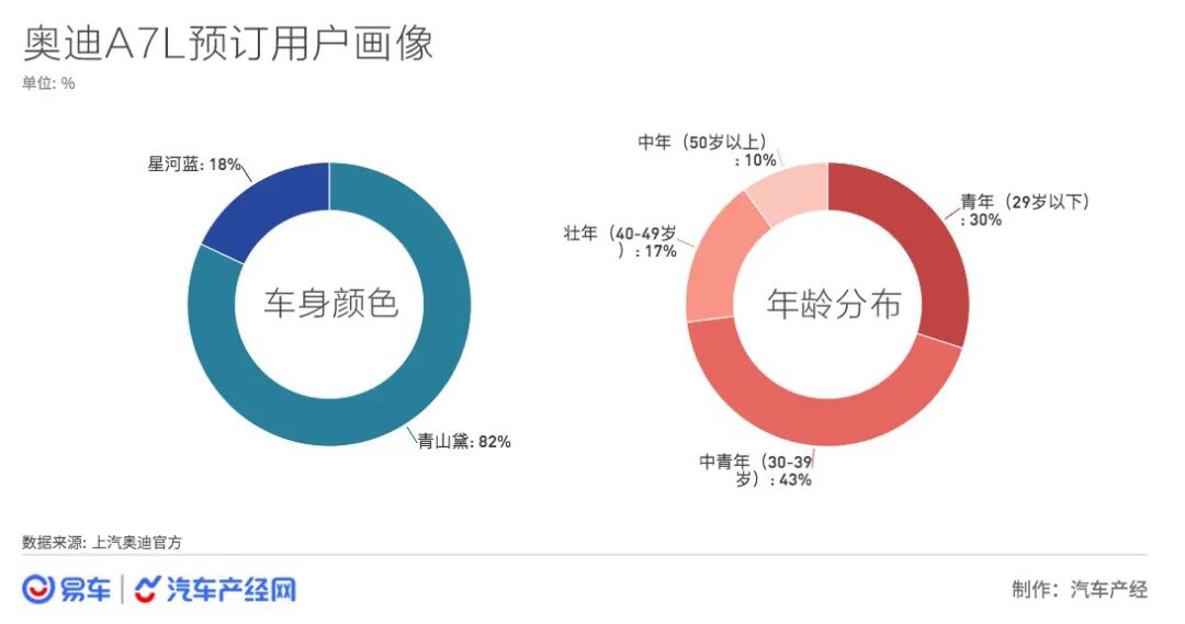 从7月18日全新奥迪A7L先行版开启预订以来,已有超过1000名用户通过上汽奥迪App支付了订金。这些用户中,82%选择了青山黛的车身颜色,73%的年龄低于40岁,甚至贾鸣镝提到,在接待过程里没有一个客户问过有没有黑色。