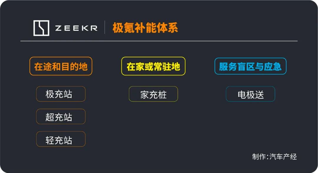 在补能方面,极氪基于场景不同,规划了三种方式构成的补能体系。